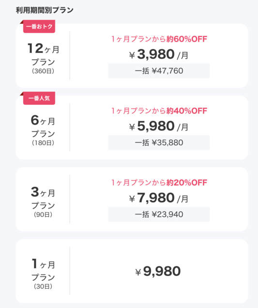 | 12ヶ月プラン | 360日 | ¥3,980 | ¥47,760 |