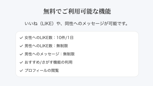 そのため、同性同士の交流やマッチングを目的とした使い方であれば、無料のままでも十分に活用できます。