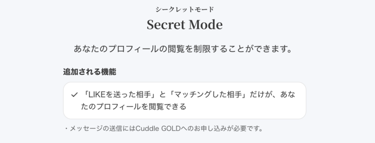 このプランに加入すると、あなたのプロフィールを閲覧できる相手が「自分からLIKEを送った相手」と「マッチングが成立した相手」のみに限定されます。