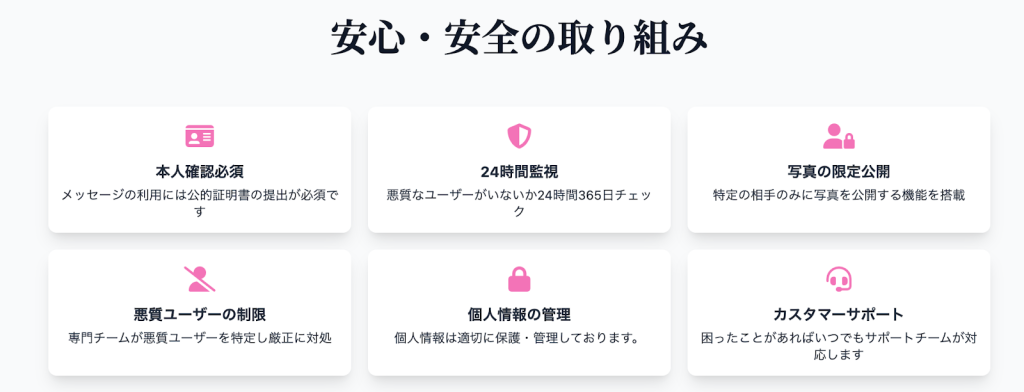 メッセージ機能を利用するには公的証明書の提出が必須となっており、年齢や本人確認がしっかり行われています。