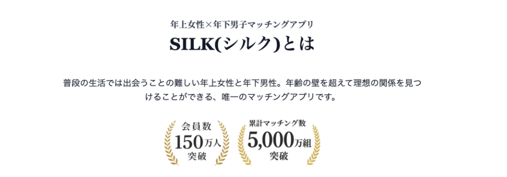 SILK(シルク)は、年上女性と年下男性の出会いを中心にしたマッチングアプリです。