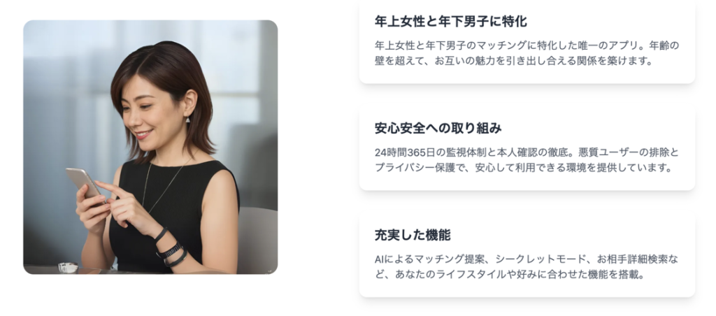 年上女性×年下男性のマッチングを前提としているため、女性のほうが積極的に動く傾向があるのが特徴です。